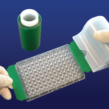 The re-usable polypropylene applicator protects the sealing film from dust and contaminants and can be stood on end when not in use to minimize space. Each sheet is separated by an adhesive free, color-coded band which allows the user to pull the next sheet without touching the adhesive. Once the film is adhered to the plate, the seal can be perforated from the roll by squeezing the dispenser, in order to prevent the release of additional sheets, and moving it sideways to initiate separation of the sheet from the roll. The smooth lower surface or back-side of the applicator can be used to seal the film to the plate. Replacement rolls can be easily installed by releasing the locking clasps to open the applicator.