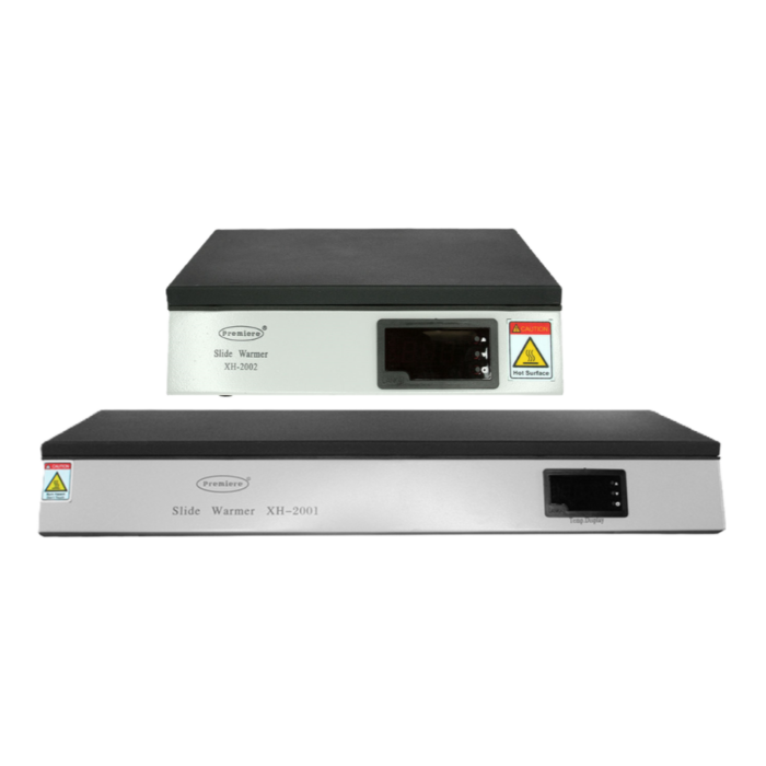 The large and small slide warmers have advanced digital temperature control complete with an LED display, ensuring precise and uniform heat distribution. Users can adjust the heated surface from room temperature up to 75°C, facilitated by an additional SET button for easy switching between set and actual temperatures.